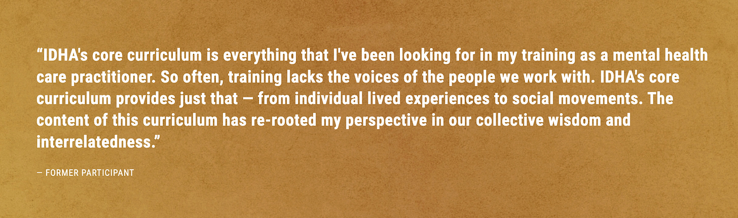 IDHA’s Transformative Mental Health Core Curriculum draws upon knowledge and traditions across a range of disciplines, social movements, geographies, and perspectives to advance approaches to mental health care rooted in humanity, care, and support.